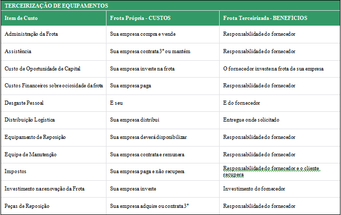 Ao optar pela terceirização, as empresas transferem para o fornecedor não só a responsabilidade pela aquisição e renovação da frota, como também uma série de outros serviços e controles que, somados, implicam não somente em custos significativos , mas em atividade extra, o que pode vir a causar entrave no processo como um todo. Estas responsabilidades por já estarem incorporados à terceirização, tornam esta uma alternativa atrativa.